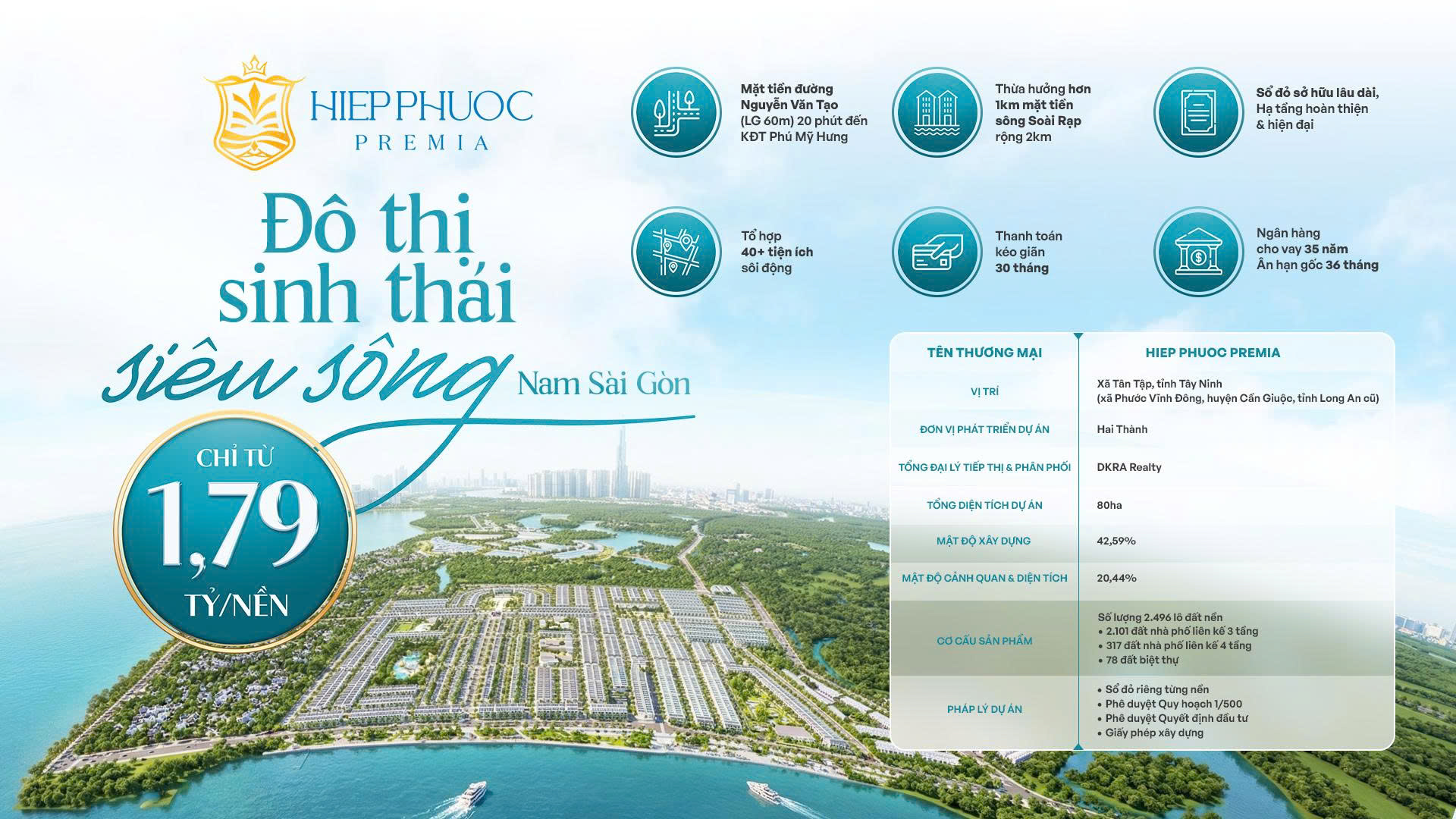 Tọa lạc tại vị trí chiến lược trên mặt tiền đường Nguyễn Văn Tạo nối dài, liền kề KCN & Cảng Quốc tế Hiệp Phước, Hiệp Phước Premia là dự án Khu đô thị sinh thái quy mô 50ha tâm huyết của chủ đầu tư Hai Thành Group.